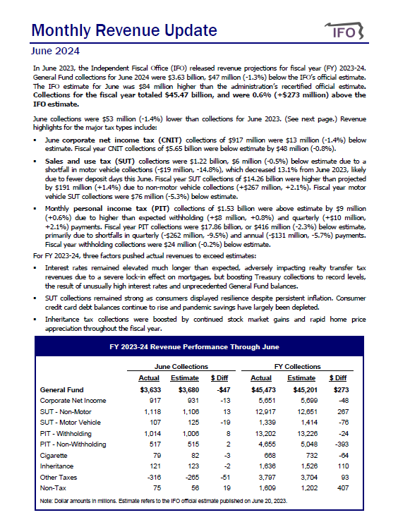 The IFO released its initial revenue estimate for FY 2025-26. Click the hyperlink above to view the report and presentation.