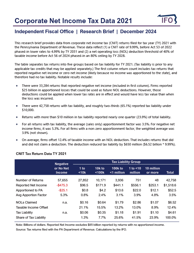 The IFO released a report that outlines options for sales-use tax (SUT) base expansion. The report includes (1) an overview of the tax and recent collection trends, (2) a comparison to other states, (3) estimates for expansion of the SUT base to 15 additional goods and services, (4) a discussion of tax incidence across six income groups and (5) the impact of the current tax on the 67 counties. The report fulfills the office’s statutory obligation under Section 604-B (a)(5) of the Administrative Code of 1929.